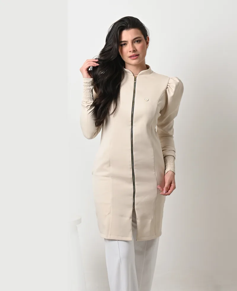 Jaleco Slim Feminino Dama com gola padre, manga longa com detalhe bufante (tipo princesa), punho de elastex, bolsos laterais embutidos e fechamento em zíper de metal central.